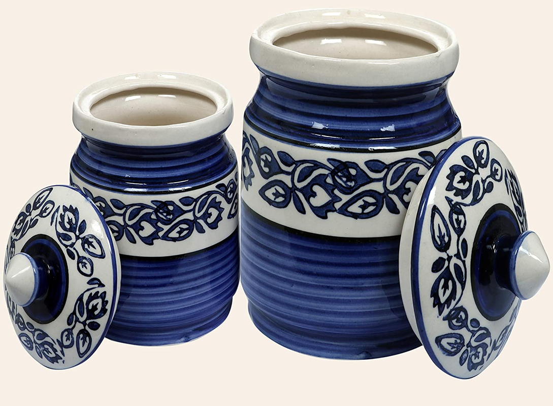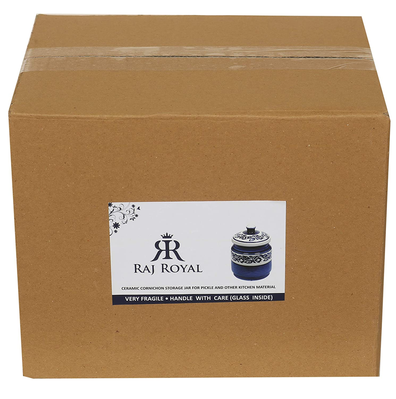 RAJ ROYAL Blue Pottery Hand Painted Cornichon Storage Jar Container with Lid Mughal Ceramic Food Storage Multipurpose Storage Container for Home – 1 Piece, Blue